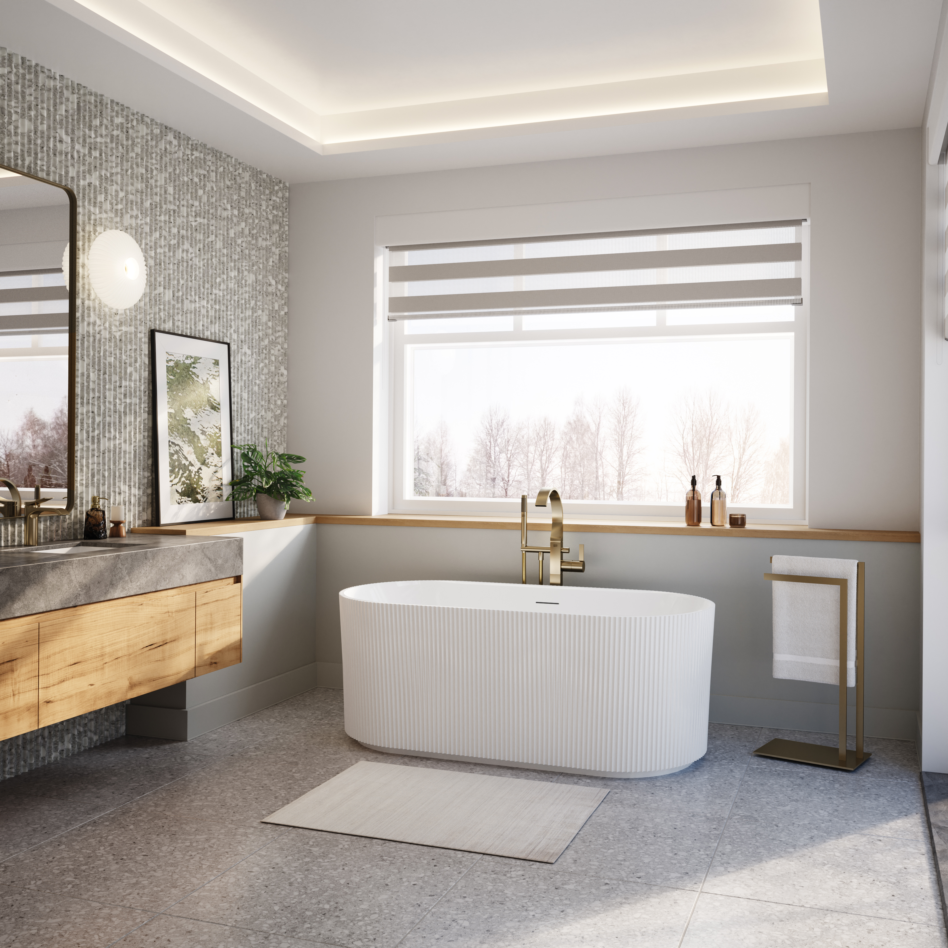 - Trimless linear overflow and white pop-up drain to match any faucet finish